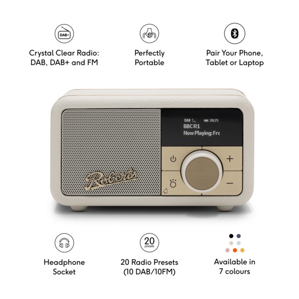 Roberts's REVIVALPETITE2PC Revival Petite 2 is a compact, portable radio that combines retro style with modern functionality. Featuring DAB+/FM radio, Bluetooth connectivity, and a rechargeable battery, this radio is perfect for music lovers on the go. With its Pastel Cream colour and state of the art features, it offers a delightful listening experience wherever you are.