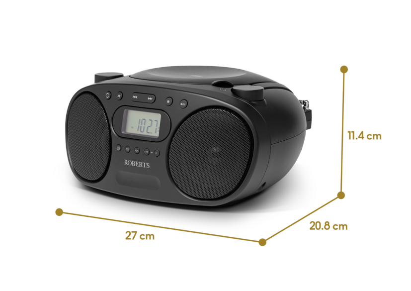 The Roberts ZOOMBOXFMBK Black FM Zoombox is a simple and portable FM/AM radio boombox with a stylish design. With a built-in CD player, headphone socket, and dual speakers, it delivers strong, clear sound making it an ideal companion for any music lover on the go.