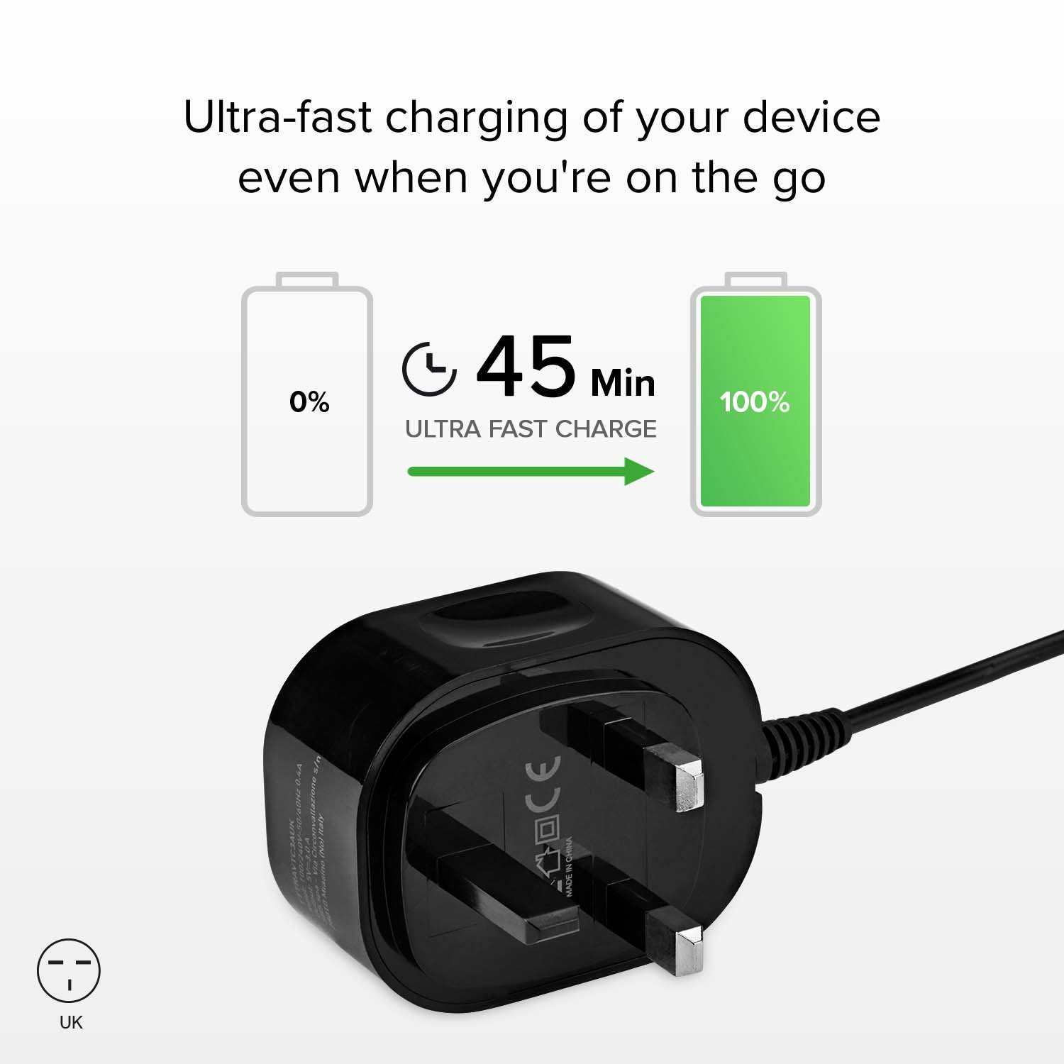 Designed with the traveller in mind, this charger features a UK plug and collapsible design, making it convenient to use in various locations. The charger's compact and lightweight construction allows it to fit easily into your suitcase or backpack, ensuring that you never have to worry about running out of battery while on the move.
