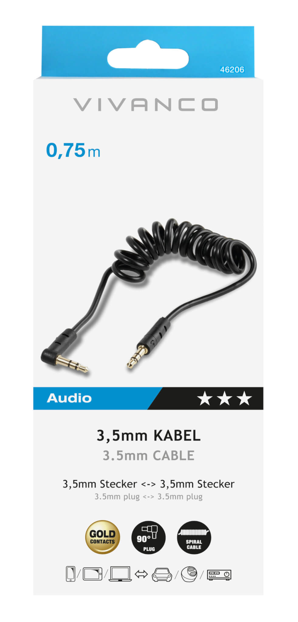 Vivanco 46206 3.5mm spiral cable gives you a reliable stereo connection. The spiral design keeps things neat and compact while giving you the stretch you need when connecting devices.