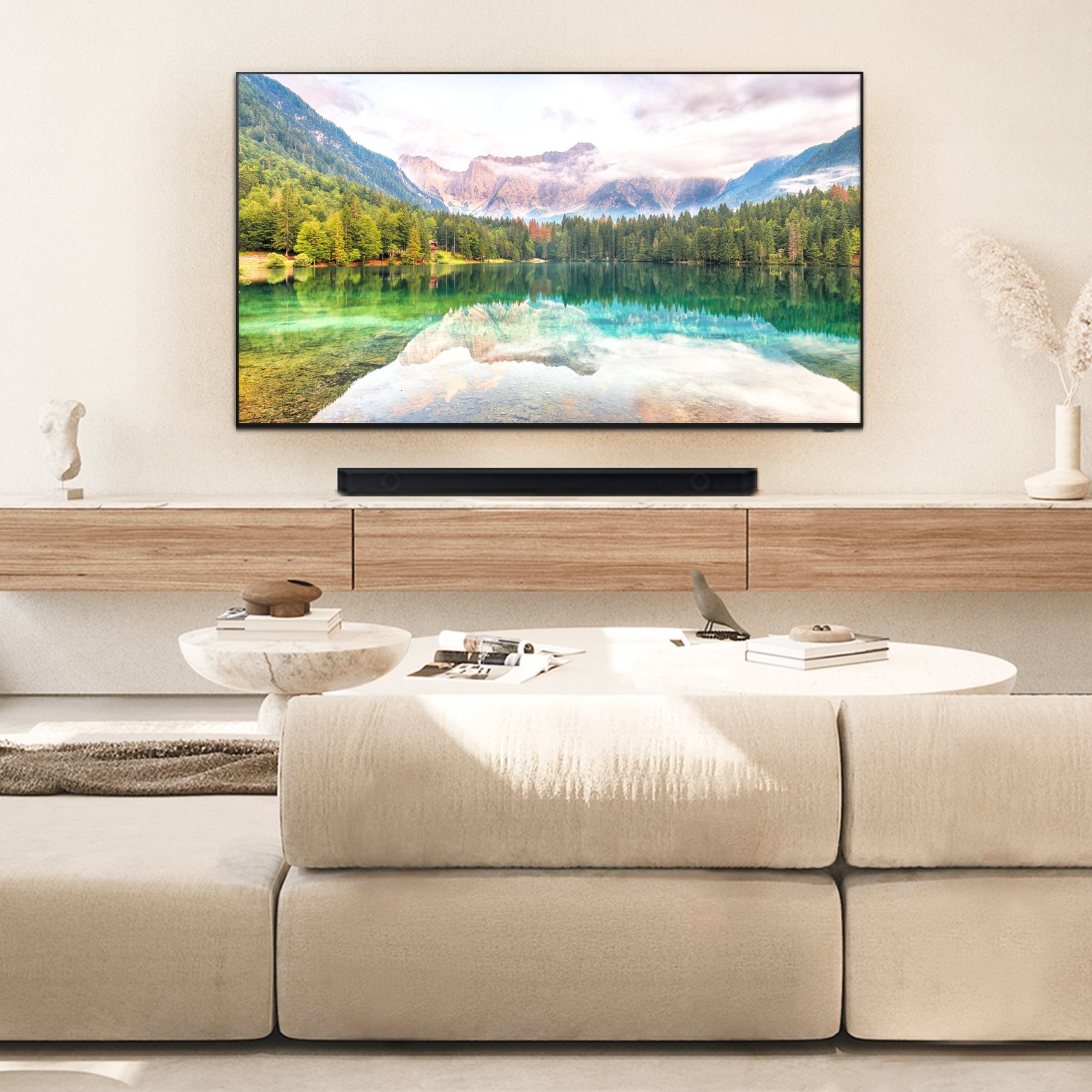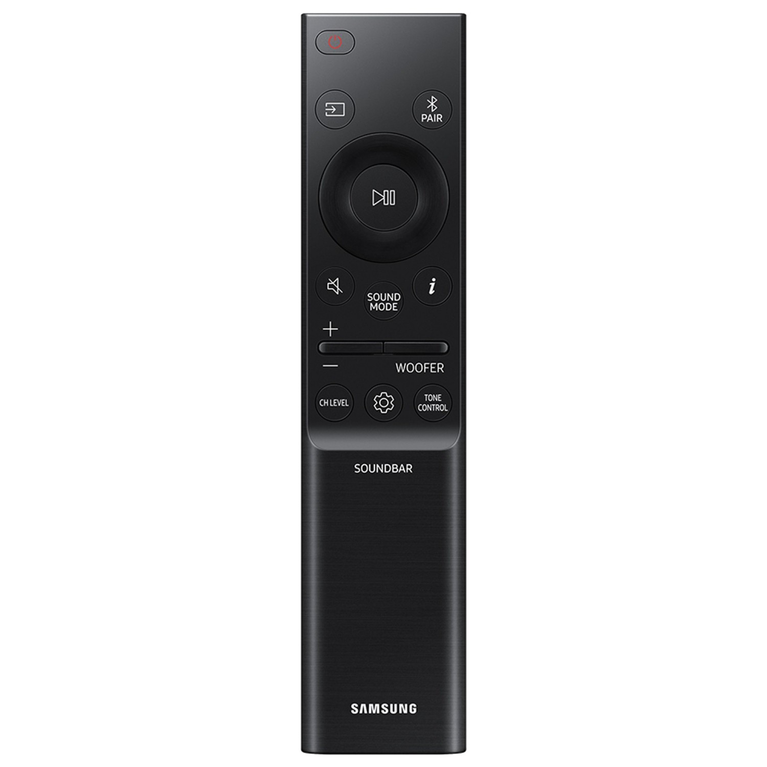 The soundbar features Q-Symphony, allowing it to work in harmony with compatible Samsung TVs, providing an integrated surround sound experience. SpaceFit Sound Pro uses a built in microphone to analyse room acoustics and optimise sound quality, ensuring the best possible audio performance tailored to your environment.
