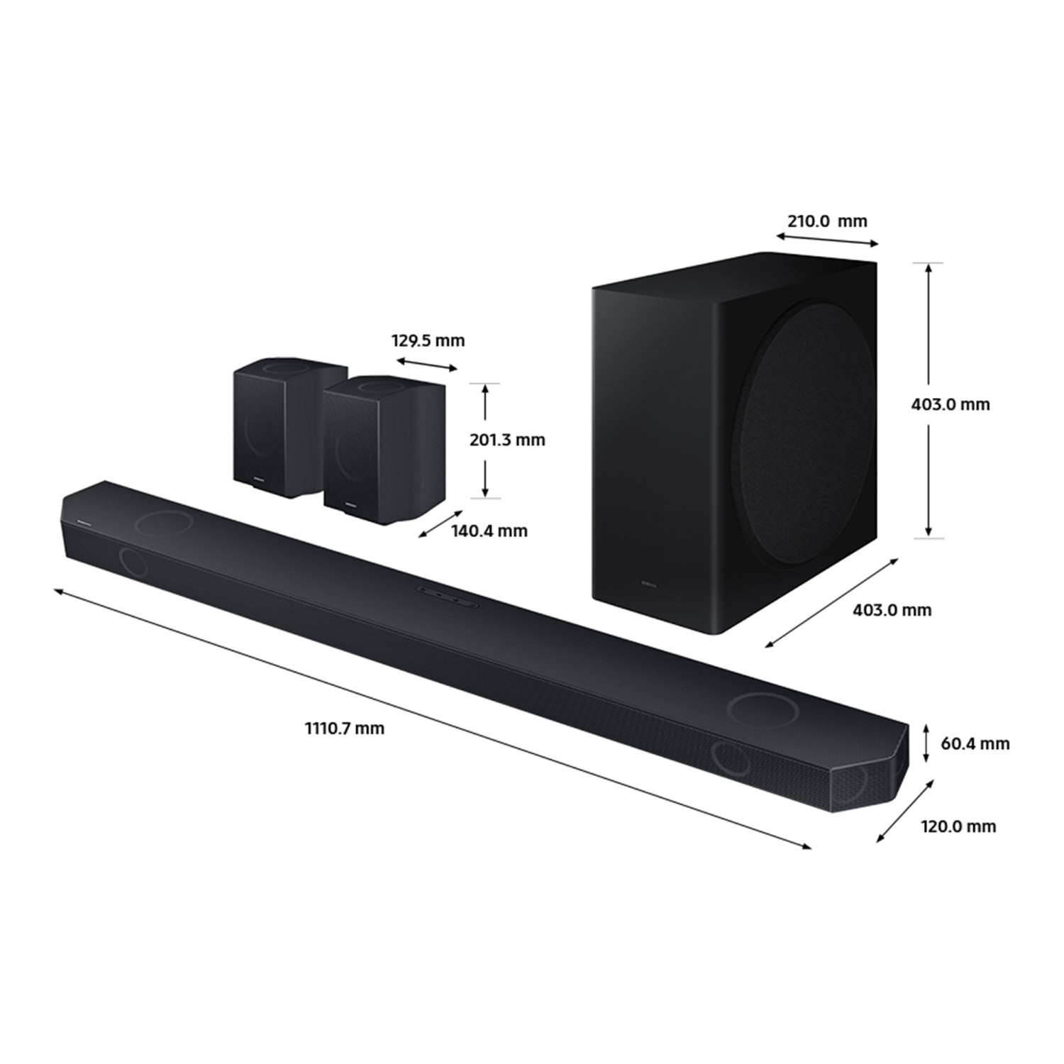 Samsung's HW-Q930D/XU 9.1.4ch soundbar, subwoofer and speakers offers an immersive audio experience with its powerful 540W output and 17 built in speakers. Designed to enhance your enjoyment of music, TV shows, and films, this soundbar delivers precise surround sound with advanced features like Dolby Atmos and Q-Symphony, making it a perfect addition to any home entertainment setup.