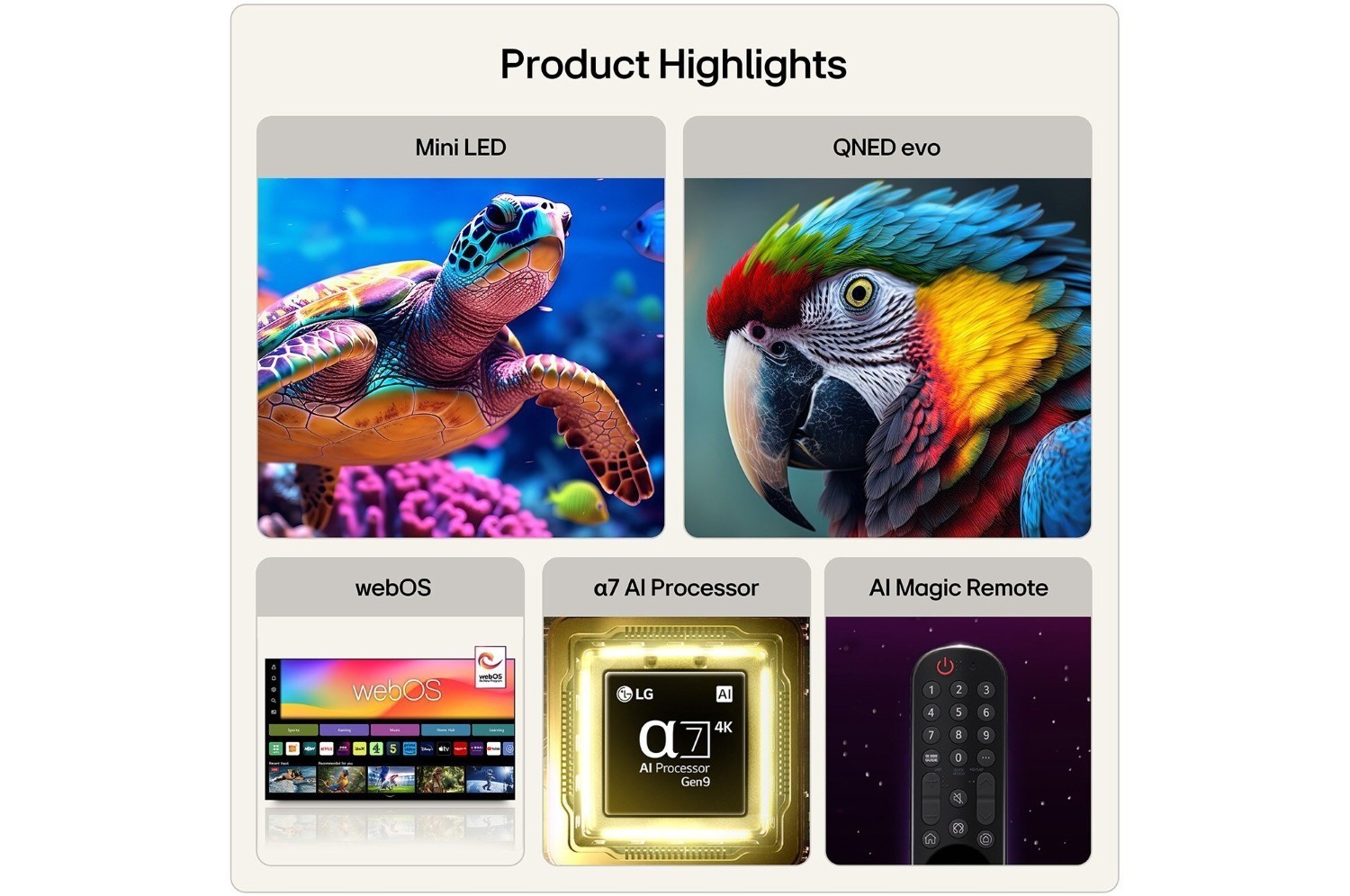 | TV Features: | 4K, Art Mode, Bluetooth, HDR, Mini LED, QLED, QNED, Smart TV, Swipe & Share, USB Playback, Voice Assistant |