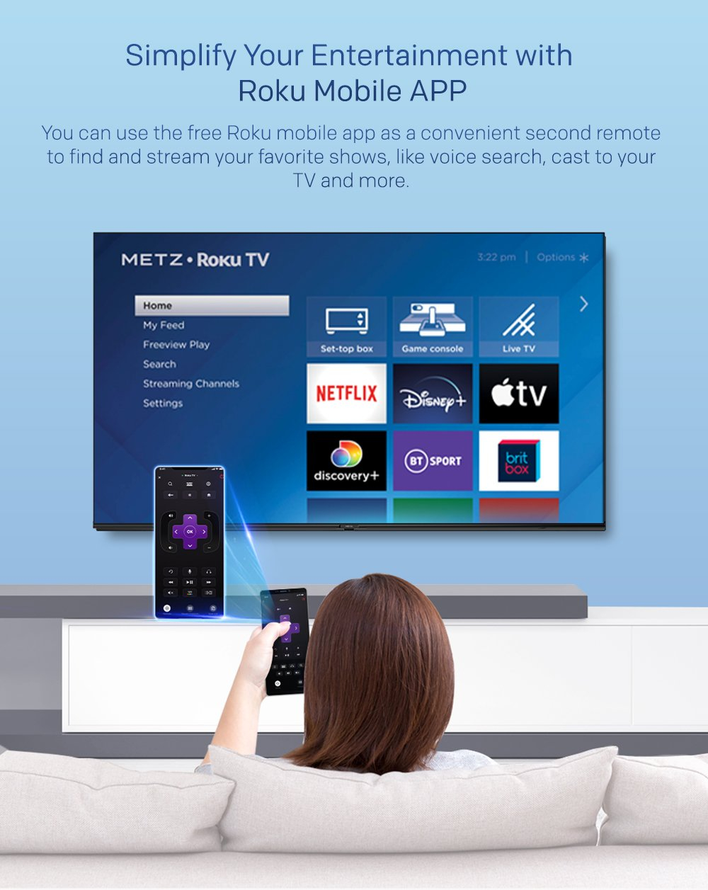 Powered by the Roku OS TV platform, the TV offers a unified and straightforward interface that brings together Freeview HD and a wide range of popular streaming services, including Netflix, Disney+, Amazon Prime Video and more. With fast navigation and easy setup, it’s designed for convenience and versatility.
