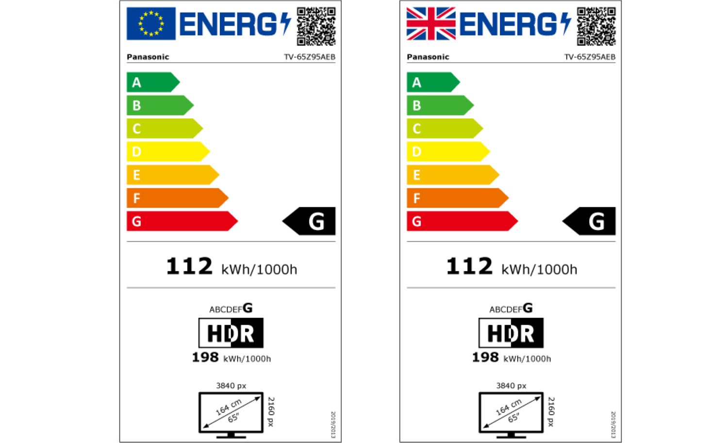 The Panasonic 65 inch OLED Fire TV has an energy efficiency rating of G, with a rated power consumption of 640W. It includes an ambient sensor (CATS) to adjust the screen brightness based on the lighting conditions in the room.