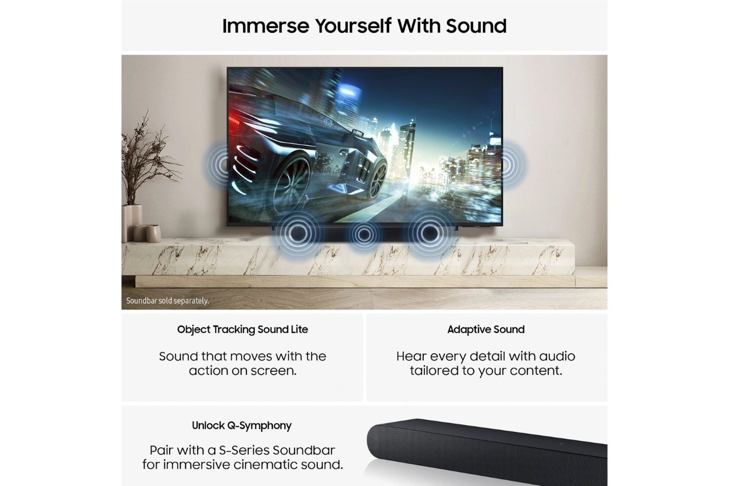 Technologies like Object Tracking Sound Lite and Samsung Q-Symphony deliver an unparalleled audio experience, equally as impressive as the visuals. Sound elements synchronise perfectly with the on screen action, creating a fully immersive environment to enhance your viewing pleasure, whether you're watching movies, playing games, or enjoying music.