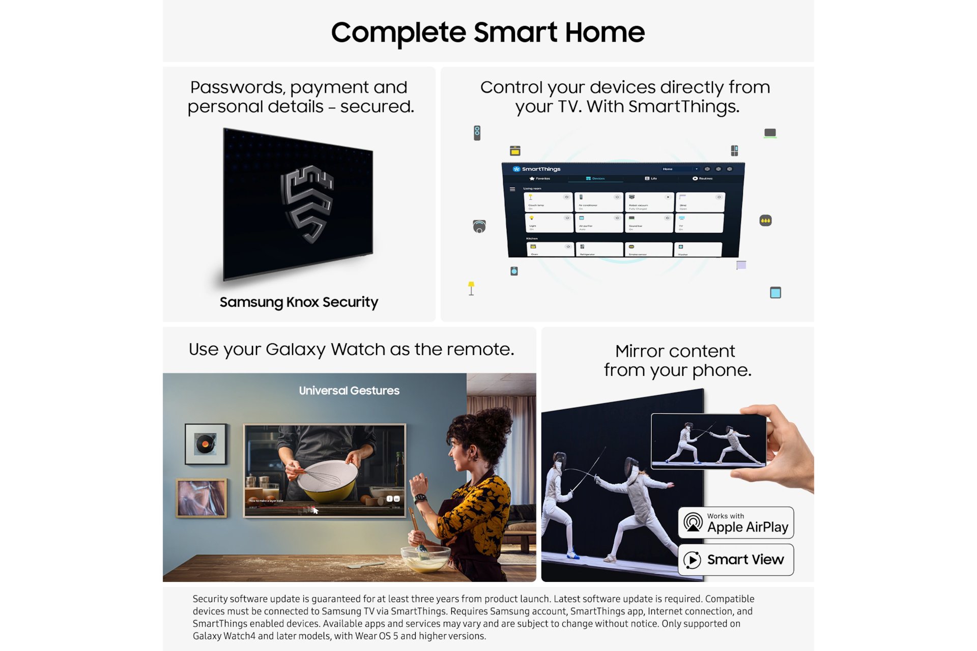| TV Features: | 4K, Art Mode, Bluetooth, HDR, Mini LED, QLED, Samsung TV Plus Guide, Smart TV, Swipe & Share, Twin Tuner, USB Playback, USB Record, Voice Assistant |