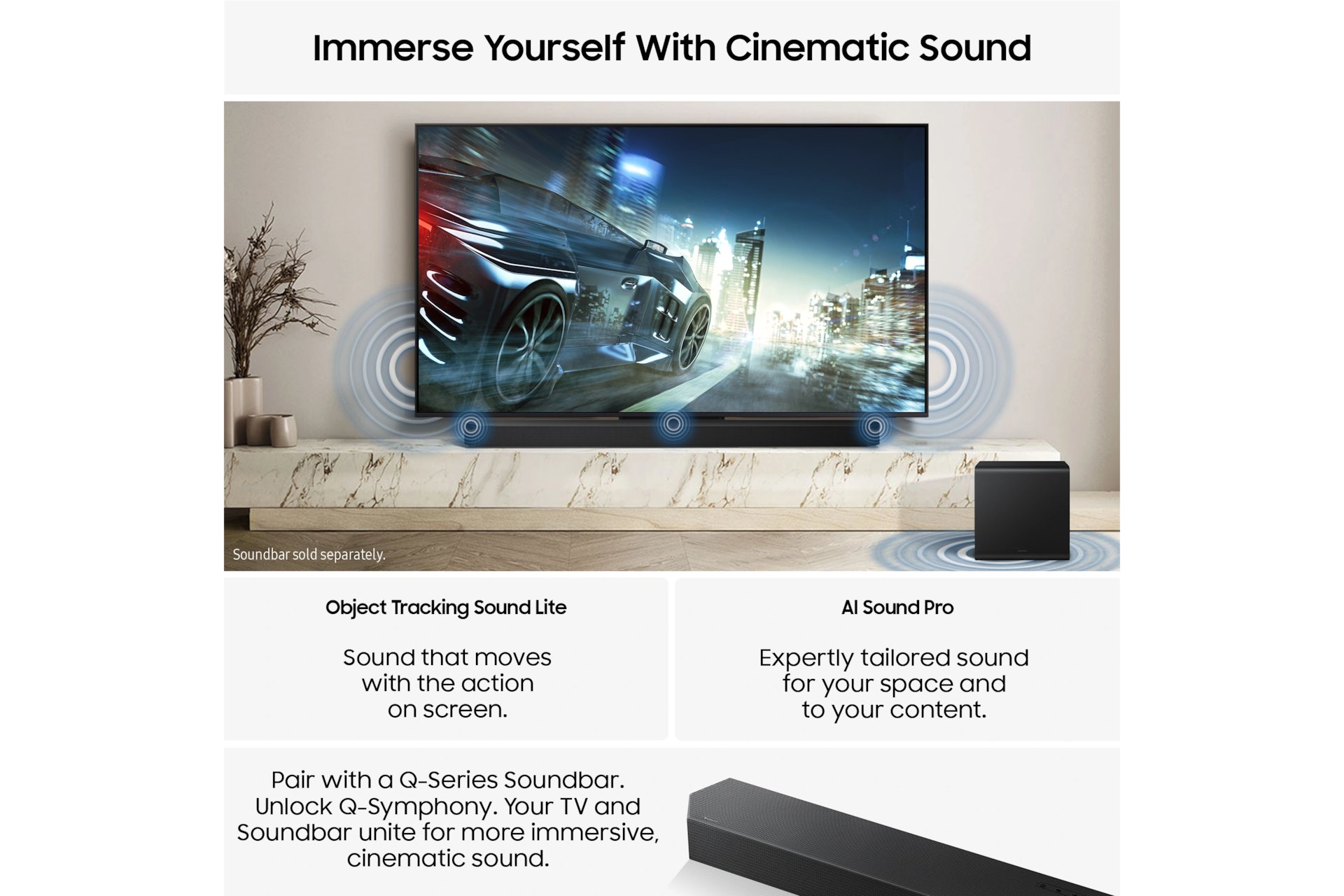This TV incorporates Samsung's Object Tracking Sound Lite technology, creating a realistic audio experience by aligning sounds with on screen action. With Samsung Q Symphony, you can enhance your audio experience by synchronising the sound from compatible soundbars, providing a premium surround sound experience, all while enjoying your favourite media.