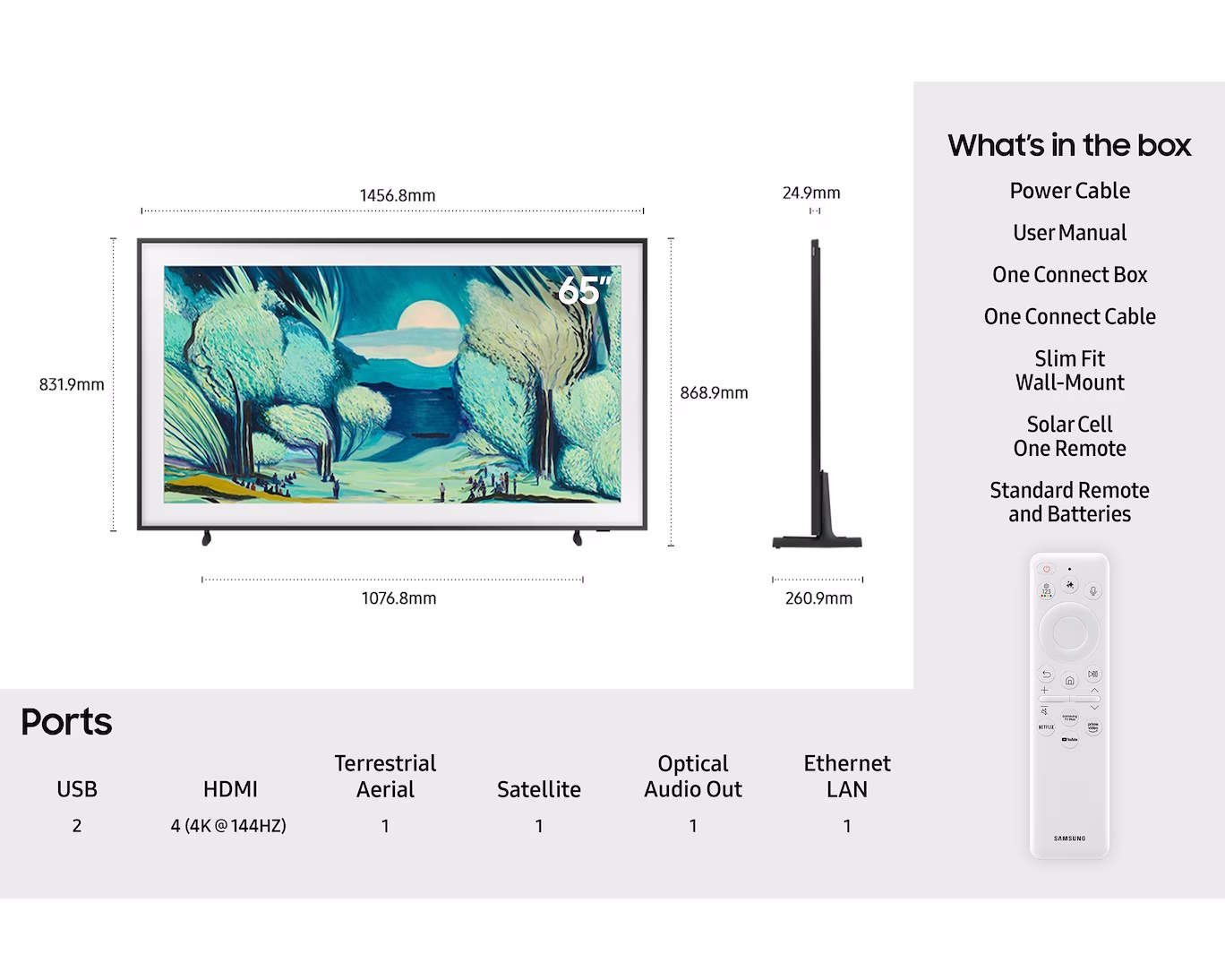 | TV Features: | 4K, Art Mode, Bluetooth, QLED, Smart TV, The Frame, USB Playback, USB Record |