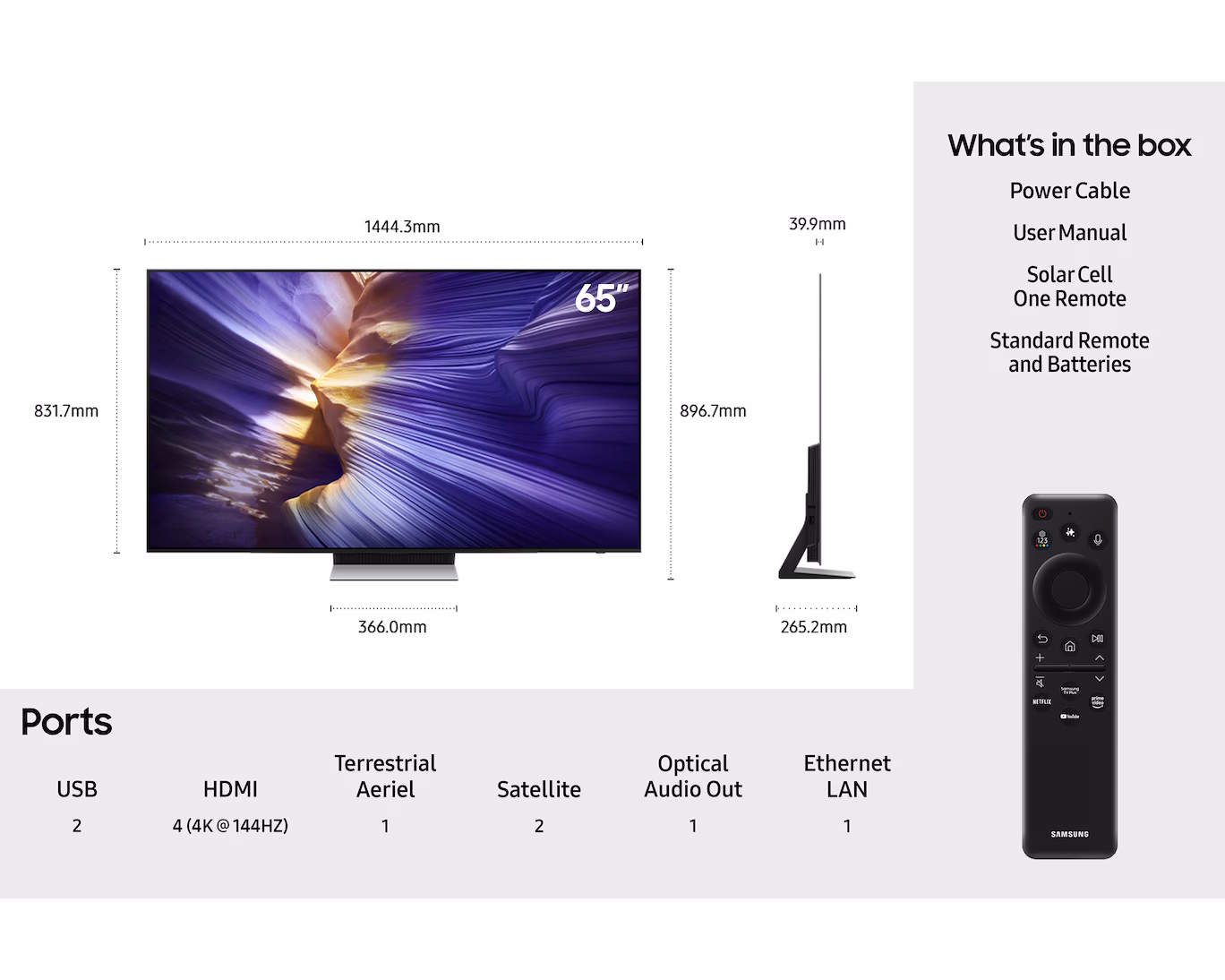 The QE65S90FATXXU TV is equipped with intuitive smart features, allowing you to effortlessly access streaming services, interactive applications, and realtime content recommendations. With voice assistant technology, you can control your viewing experience with simple voice commands. The TV offers extensive connectivity options, including Bluetooth, WiFi, four HDMI ports, and two USB ports, ensuring compatibility with a wide range of devices.