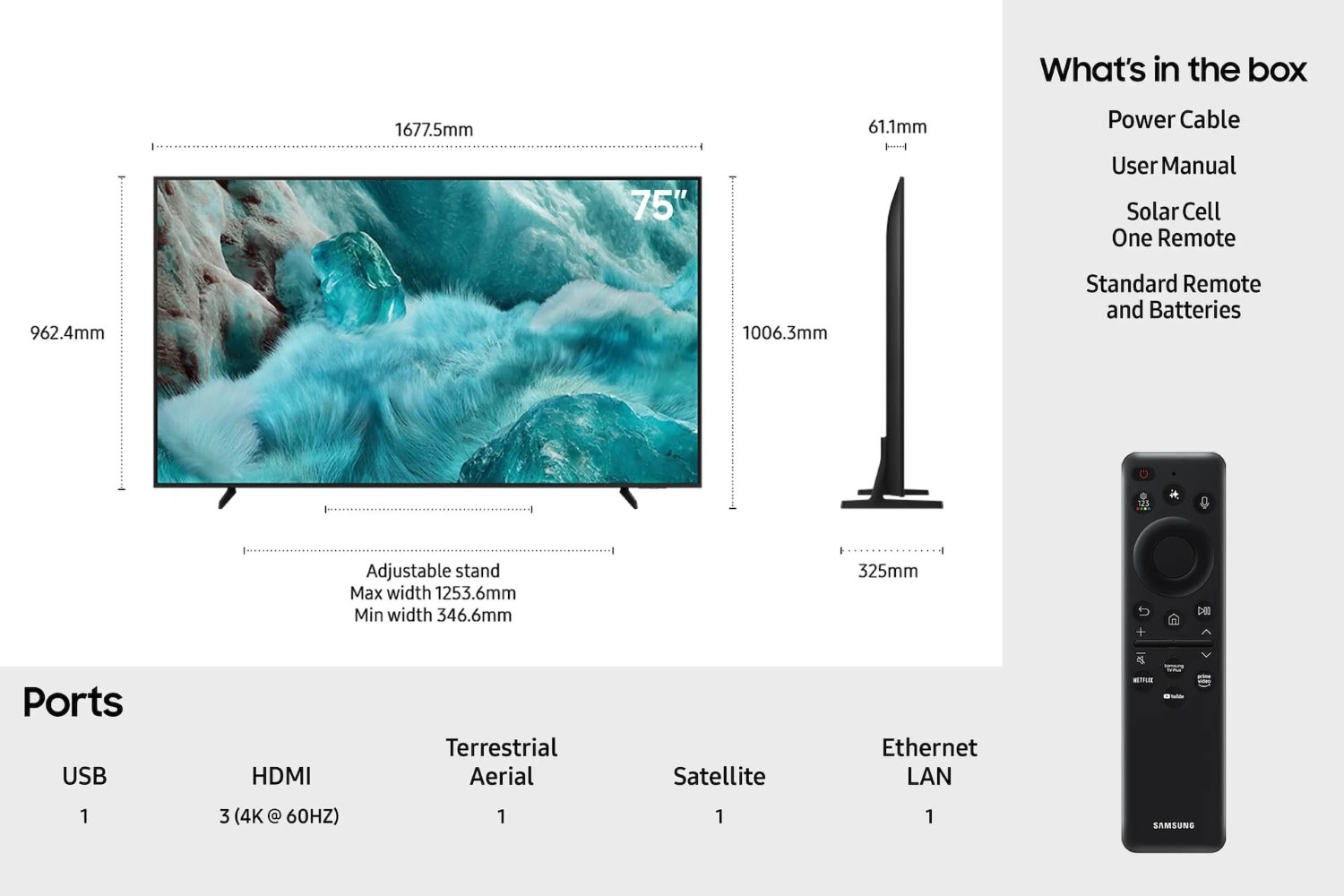 | TV Features: | 4K, Art Mode, Bluetooth, HDR, QLED, Samsung TV Plus Guide, Smart TV, Swipe & Share, USB Playback, Voice Assistant |