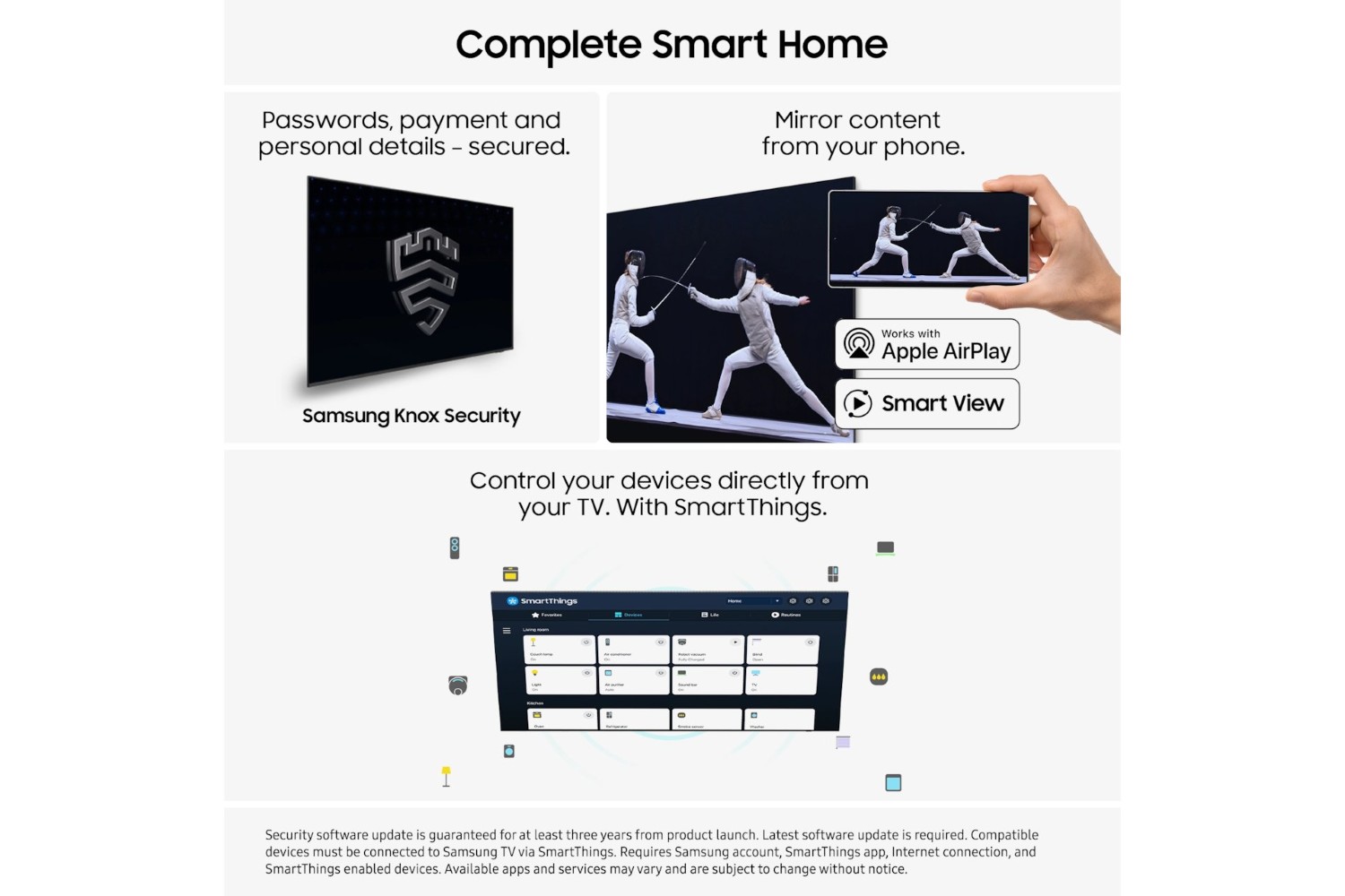 Samsung's integrated SmartThings functionality allows you to connect and control all your smart devices from this TV. Features like Quick Remote and Universal Gestures mean that managing your entertainment has never been easier. Samsung Knox security ensures that your personal data remains protected while you enjoy your favourite content.