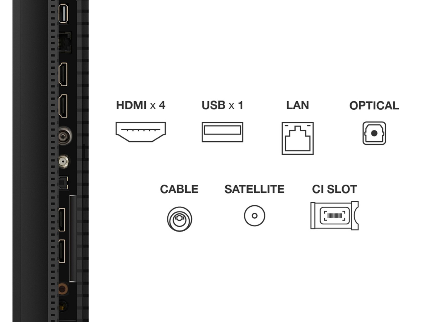 The 50Q6C-UK supports Google TV, offering easy navigation and access to a wide range of content, including popular services like BBC iPlayer, Netflix, Amazon Video, and YouTube. With Apple AirPlay 2 compatibility, sharing content from your devices is effortless. The TV includes four HDMI 2.1 ports, one USB port, Bluetooth, and WiFi, ensuring versatile connectivity options for all your devices.