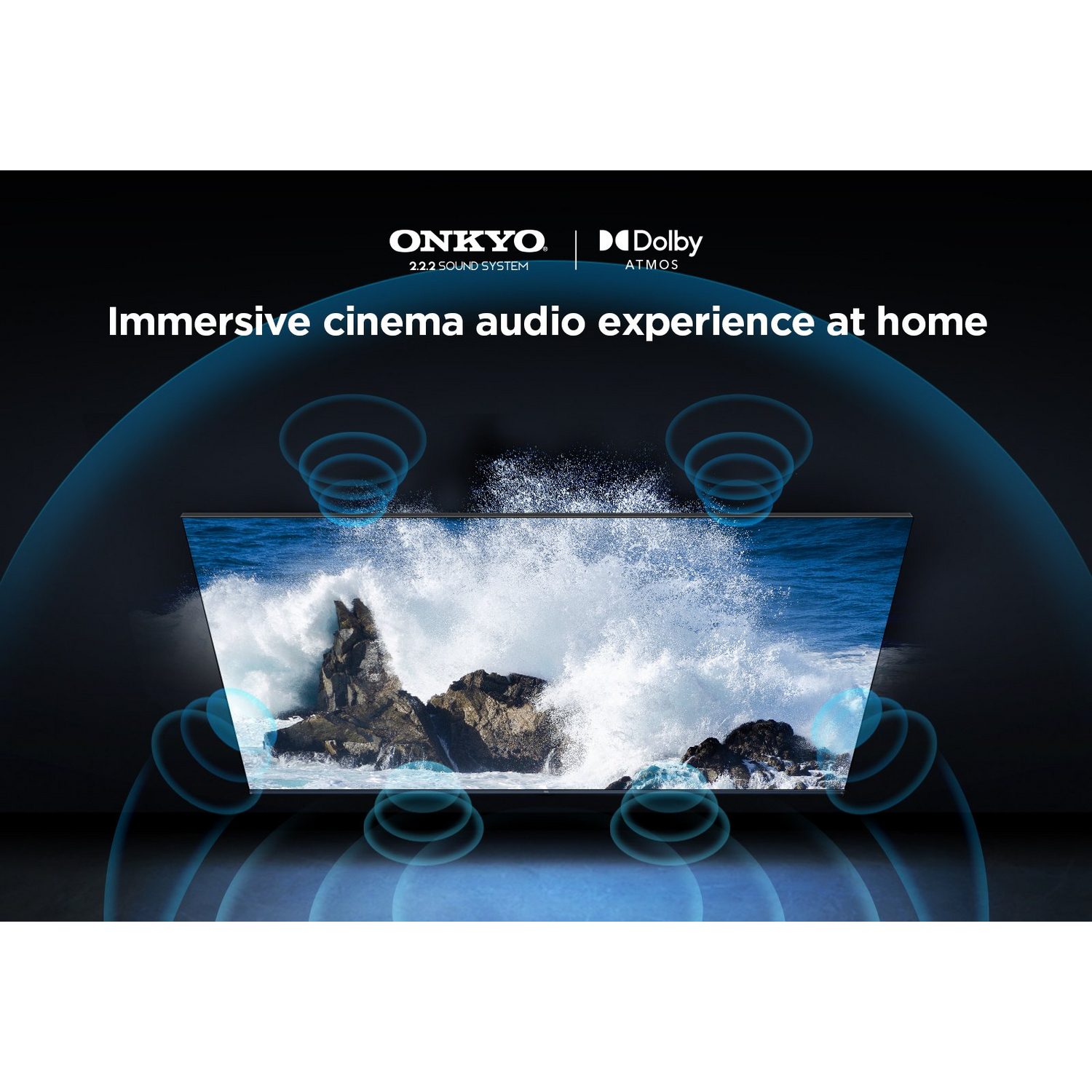 The 98C855K features a bezel-less slim design with a brushed titanium finish, adding a touch of elegance to any space. The Onkyo 2.2.2 sound system, combined with Dolby Atmos, delivers immersive audio that complements the stunning visuals. Hands Free Voice Control and compatibility with Google Assistant and Alexa provide added convenience.