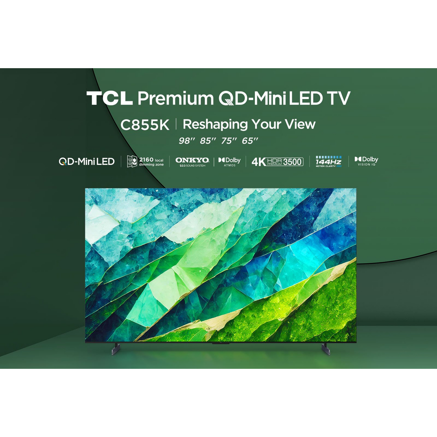 TCL's 98C855K QLED Google TV offers an immersive viewing experience with its expansive screen and advanced display technologies. Featuring QD Mini LED and 4K HDR display, this TV delivers stunning visuals with precise contrast and vibrant colours. With smart features, extensive connectivity options, and an outstanding design, it is perfect for any modern home entertainment setup.